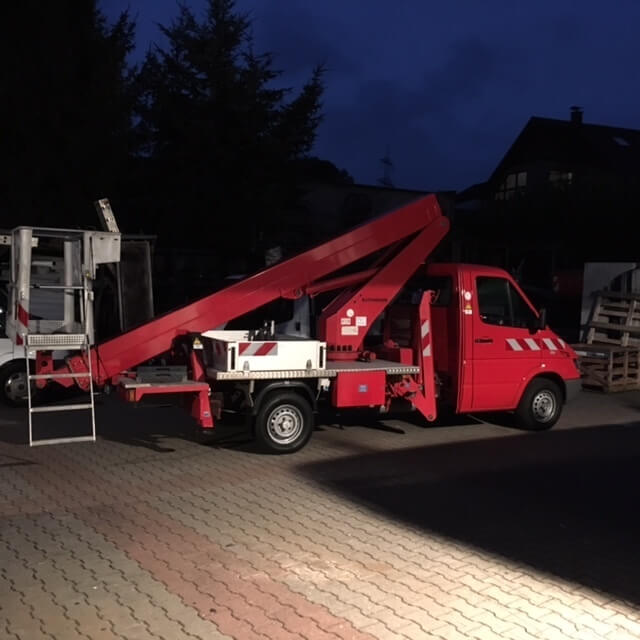 Wir verfügen über einen modernen Fahrzeug- und Maschinenpark. Darunter sind drei Aufzüge, der Neueste ist von 2017 und bietet 26 Meter Steighöhe.