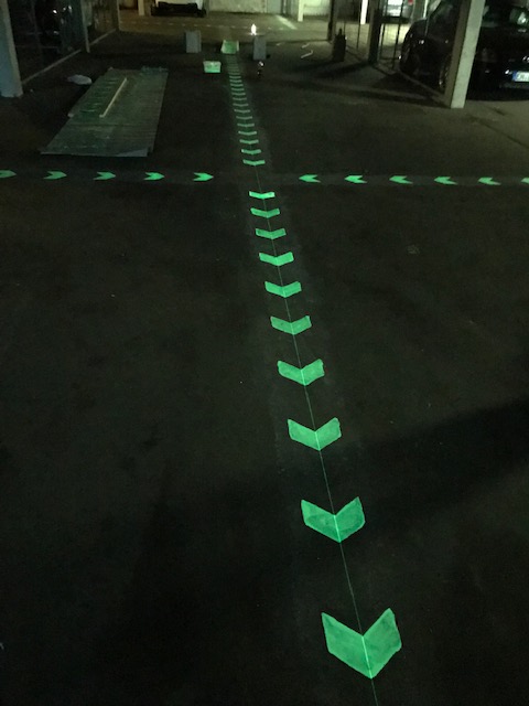 Wir bieten auch nachleuchtende Sicherheitsmarkierungen in Tiefgaragen und Parkhäusern sowie auch in Tunneln, Industrieanlagen und Krankenhäusern usw an.